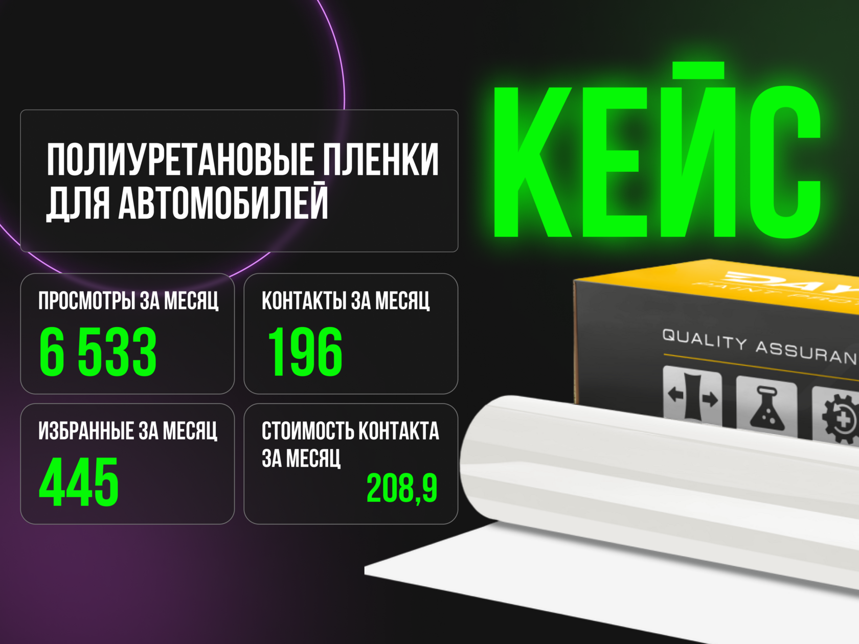В агентство Dabro обратился клиент, торгующий полиуретановыми пленками для автомобилей. Клиент не имел опыта работы на Авито и его аккаунт был создан буквально за месяц до обращения к нам. Клиент пробовал сам вести свой аккаунт, но у него не получилось и поэтому он решил доверить рекламную кампанию профессионалам.