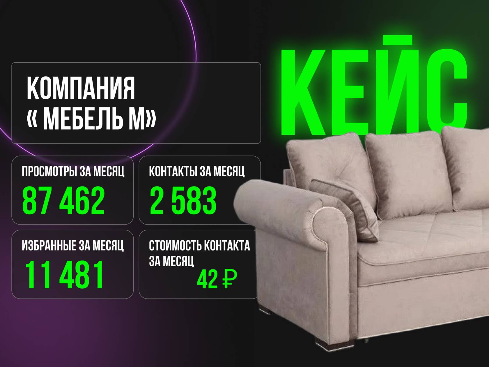 Компания « Мебель М» с 2019 года занимается производством и продажей мягкой и корпусной мебели. Клиент гордится репутацией ответственного производителя, предлагает доступные цены и оформляет доставку в день заказа. Однако, несмотря на сильные стороны бизнеса, клиент столкнулся с проблемами в продвижении на Авито: пустые просмотры и высокая стоимость контакта, не эффективный менеджер сервиса Авито.