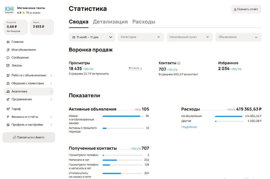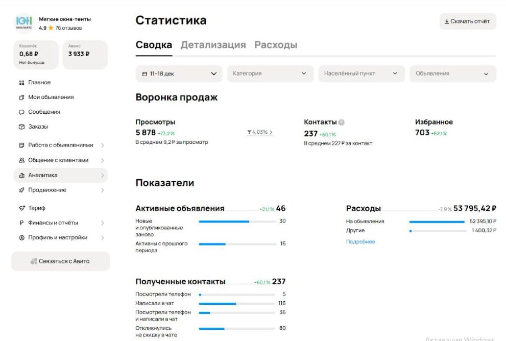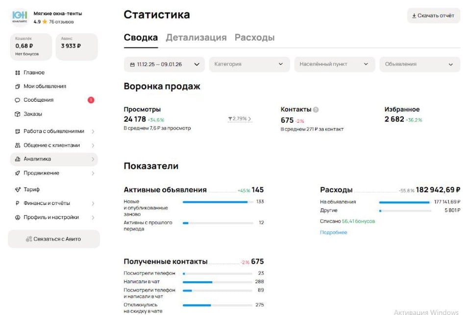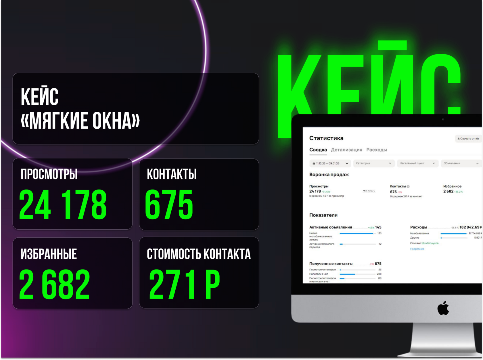 - Полностью переработали структуру аккаунта: разделили товары (мягкие окна, тенты, пвх шторы) на отдельные объявления для точного ранжирования.