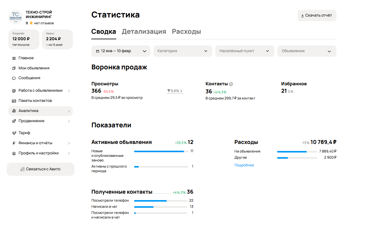 366 просмотров дали 36 контактов. Из них 28 — целевые. Конверсия просмотр → контакт: 9,8%. 21 раз добавили объявление в избранное.