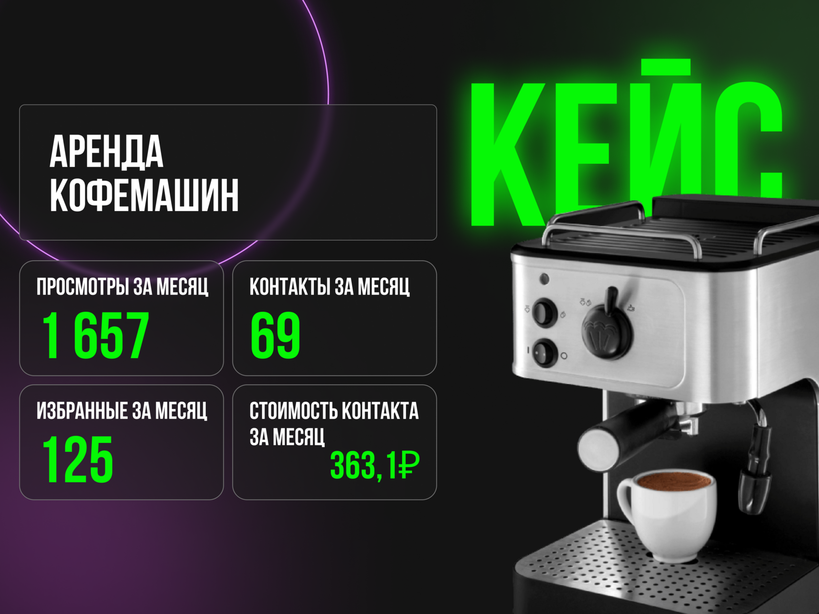 В агентство DaBro обратился клиент, который оказывает услуги по аренде кофемашин и кофеин. За период работы заказчик увеличил производственные мощности и возникла потребность в их загрузке. Местная реклама и “сарафанное радио” уже истощили свои ресурсы и клиент решил расширить охваты с помощью продвижения на Авито.